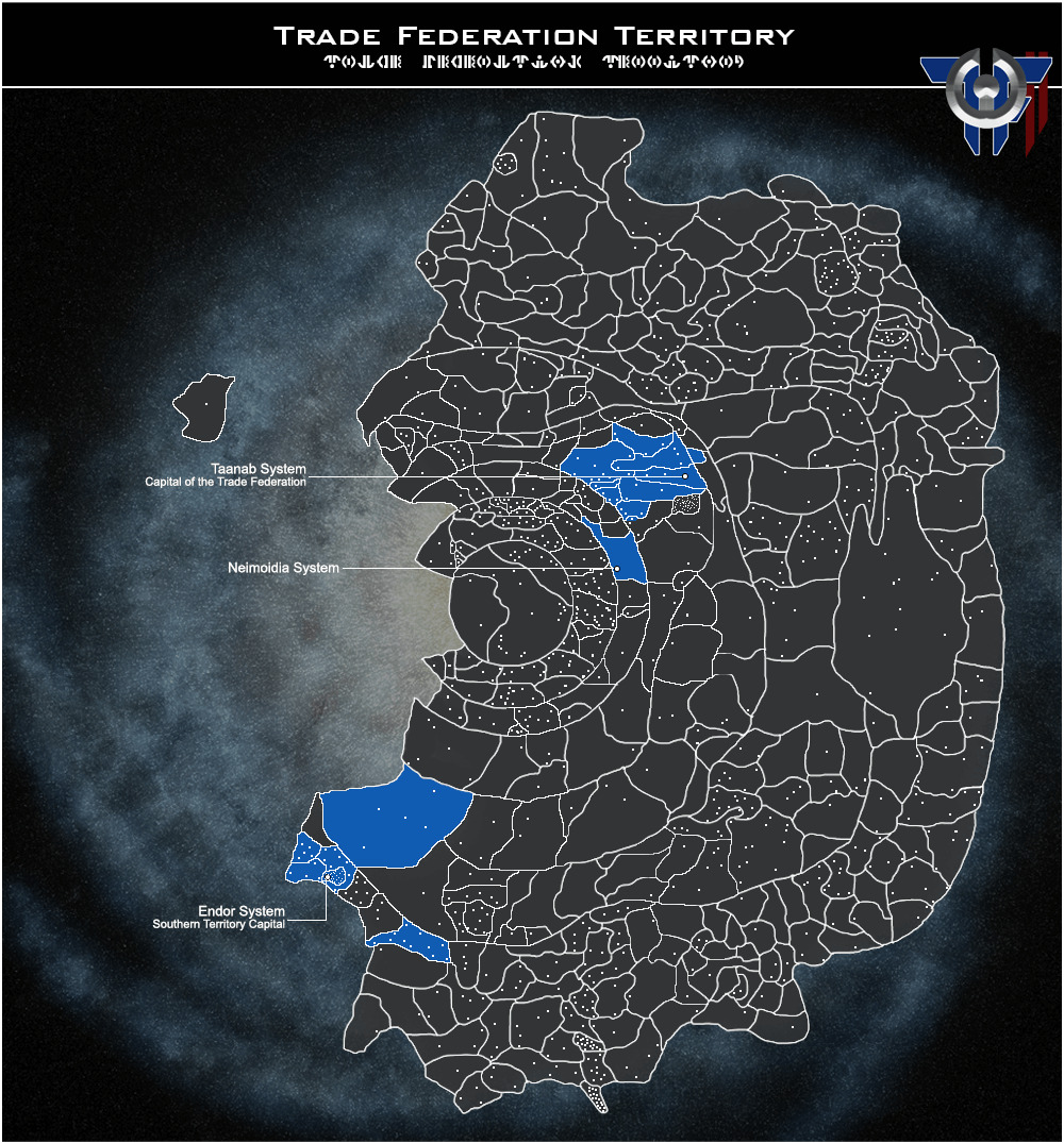 The Northern Regions are situated almost completely within the Inner Rim, sandwiched in between Imperial, Hapan and Mandalorian territory. Running through the middle of the territory lies the Perlemian Trade Route, a vital trade super-hyperroute starting at the galactic center of Coruscant and ending at Quermia. The territory is made up of 11 sectors, over 34 systems and a population totaling over 300 billion citizens. The region is home to the Trade Federation Capital System of Taanab.